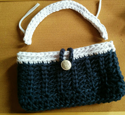 Tシャツヤーンのクラッチバッグをダイソーで買った糸で編みました。